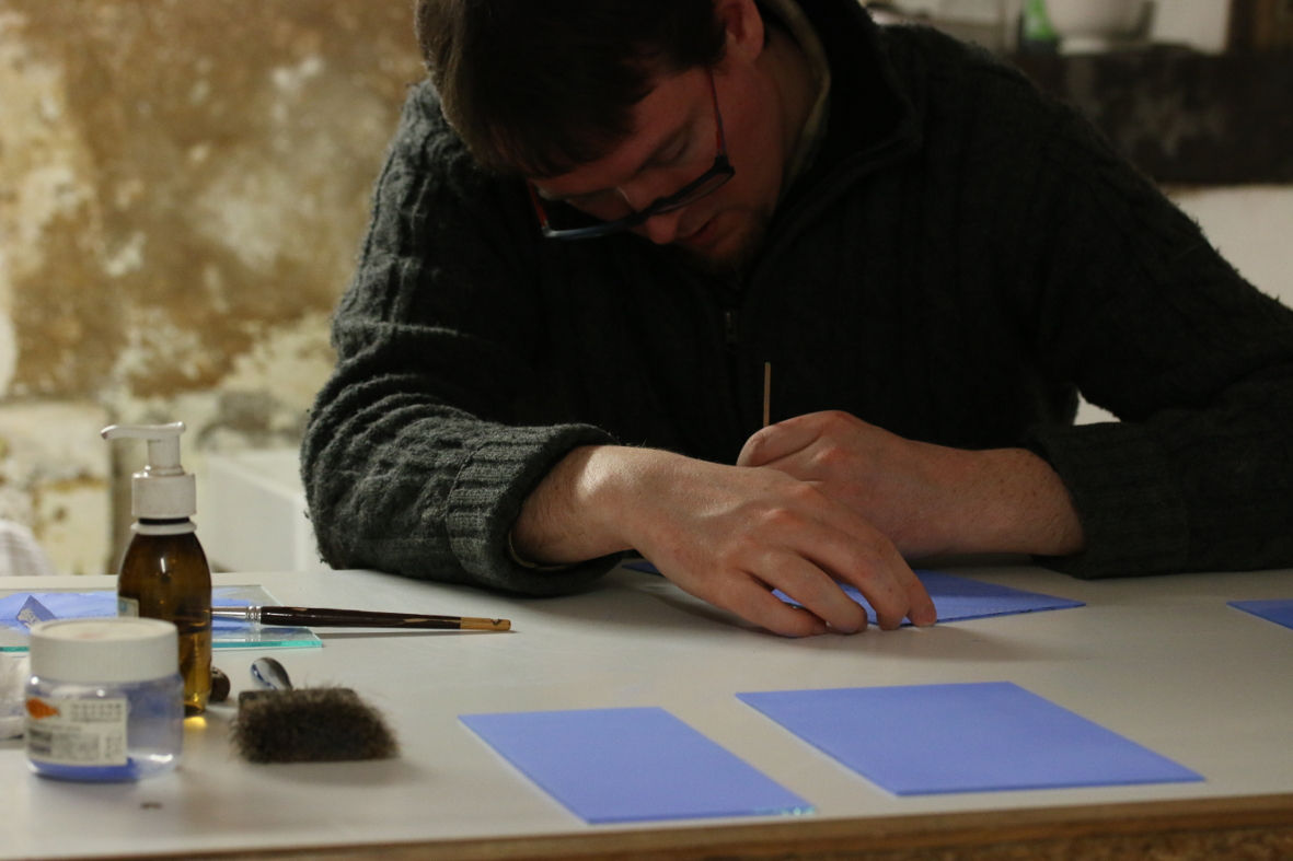 portrait Grégoire Duchamp au travail grisaille Publié janvier 16, 2018 à 1181 × 787 Grégoire Duchamp Portrait de Grégoire Duchamp, artiste verrier de renom au travail dans son atelier de Montferrand, afféré à la peinture d’une pièce de verre en grisaille bleue.